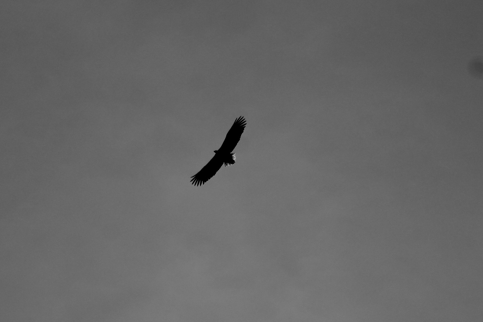 El cóndor detiene la carrera, repliega las alas y hunde el pico rebuscando la comida fácil, con la cerviz doblada al ansia y rutina primarias; mientras la silueta del cielo se aleja.