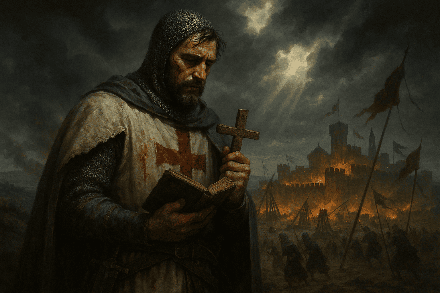 ─ El caballero Monfort participó en la última defensa de San Juan de Acre. Parece ser que antes del asedio del ejército musulmán, llegó una pequeña fuerza de mercenarios reclutados en Toscana y Lombardía bajo el mando de un tal Nicola de Tiépolo que no impidió que su gente robara y matara en las calles de la ciudad sin importar religión u origen. Fueron a enriquecerse aprovechando la confusión. Alcanzó tal nivel la violencia que los mismos caballeros del Temple tuvieron que hacer funciones de policía hasta que el enemigo rodeó las murallas y tuvieron que empeñarse en la defensa. Nuestro autor formó parte del ataque temerario que los templarios realizaron sobre el campamento egipcio para destruir las máquinas de asedio. En la retirada fue herido y evacuado a la fortaleza del Temple junto al puerto. No pudo participar en la defensa de la muralla y la Torre Maldita donde cayó mortalmente herido el Gran Maestre Beaujeu. Se confirmaba lo que sospechaban, que la ciudad estaba perdida. Fue entonces cuando el Mariscal Severy lo hizo llamar para, tras hacerle jurar que mantendría el secreto de cuanto iba a oír, le reveló que la Orden estaba en posesión de una gran reliquia que ponía bajo su custodia. El objetivo era que la trasladase a una encomienda remota del Temple con la orden de esperar allí hasta un nuevo Gran Maestre se la reclamara. Nuestro caballero se embarcó, acompañado de varios freires más, en una coca, un barco no muy grande. Debía escapar del desastre sin llamar la atención antes de que el puerto fuera bloqueado por la flota enemiga que estaba en camino.