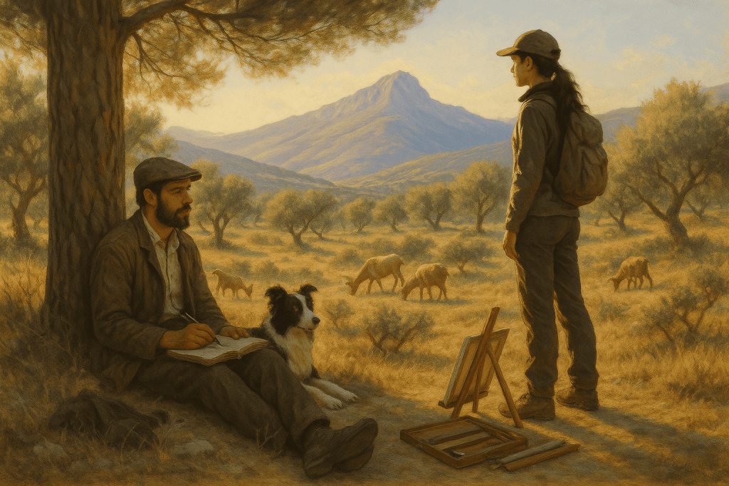 El sendero asciende sinuoso por entre los pinos que filtran la luz de la tarde en delgados rayos oblicuos. El caballete pesa y las agujas secas, que cubren el suelo, crujen bajo los pasos menudos de la mujer. No esperaba la presencia del cabrero junto a su roca-atalaya, que le sirve de lugar de trabajo desde hace semanas. Unos saludos urgentes y hoscos se cruzan sin apenas una mirada. Ella teme una conversación que no llega porque el pastor, hundido en la lectura, solo alza la cabeza para vigilar a las cabras, que buscan y rebañan entre la sequedad del suelo y los resquicios de las piedras. La mujer coloca el lienzo y abre la mochila.