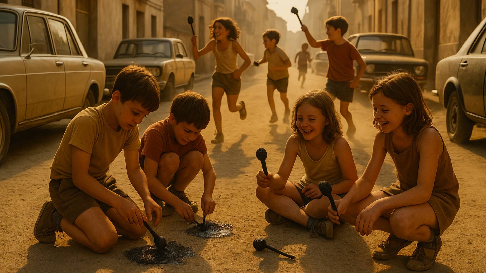 El barrio era obrero, lo que era lo mismo que decir pobre. Su estatus subió cuando comenzaron a asfaltar las calles. Aquello tuvo efectos opuestos: no podíamos jugar más a las canicas ni a la lima, pero descubrimos el arte de fabricar porras con el alquitrán recalentado. Hundíamos un palo en aquella masa negra y pegajosa, le dábamos vueltas hasta formar una bola, y luego la terminábamos sobre la arena de alguna obra, que le daba una textura granulada perfecta para endurecerla. Con las porras acabadas nos dividíamos en equipos y nos perseguíamos en batallas de cachiporrazos. Al final del día, entre chichones y risas, evaluábamos cuál tenía mejor factura y cuál había demostrado más contundencia.