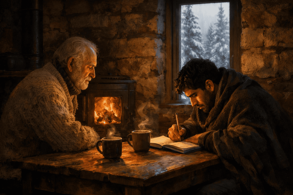 Durante la tarde, el viento volvió, más leve. El fuego era ya parte del mobiliario sonoro de la casa. Youssef, sentado junto a la ventana, dibujaba algo en el cuaderno. Andrés lo observaba sin interrumpirlo. Cuando el joven se levantó para guardar sus cosas, el anciano se dio cuenta de que el dibujo representaba la casa: el tejado blanco, la estufa encendida, una figura junto al fuego.